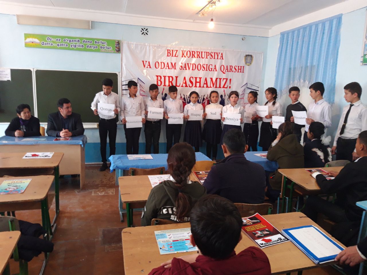 Ўзбекистон Республикаси Конституцияси қабул қилинганлигининг 27 йиллиги ҳамда 9 декабрь – Халқаро коррупцияга қарши курашиш куни муносабати билан Ғузор туман адлия бўлими томонидан 34-мактабда, Қамаши туман адлия бўлими томонидан 63-мактабда, Касби туман адлия бўлими томонидан 11-мактабда “Конституция – қомусимиз, фахримиз” мавзусида очиқ дарслар ташкил этилди.