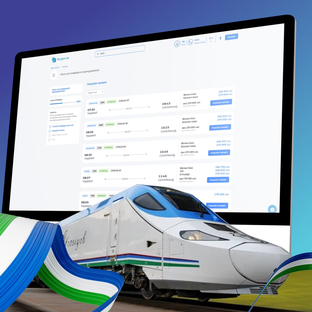 ???? Yangi xizmat: “Temir yo‘l chiptalarini rasmiylashtirish” (https://my.gov.uz/uz/service/get/1283#railway-tickets).