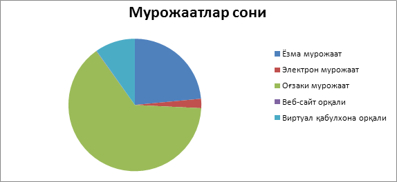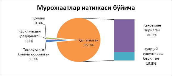 Мурожаатларни натижаси бўйича улушларга (фоиз кўринишида) бўлганда қуйидагича кўринади: