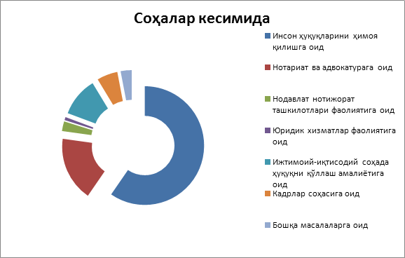 Келиб тушган жами мурожаатларининг 990 таси инсон ҳуқуқларини ҳимоя қилишга оид, 292 таси нотариат ва адвокатурага оид, 177 таси ижтимоий-иқтисодий соҳада ҳуқуқни қўллаш амалиётига оид, 94 таси кадрлар соҳасига оид, 44 таси нодавлат нотижорат ташкилотлари фаолиятига оид, 14 таси юридик хизматлар фаолиятига оид, 50 таси бошқа масалаларга оид ҳисобланади.