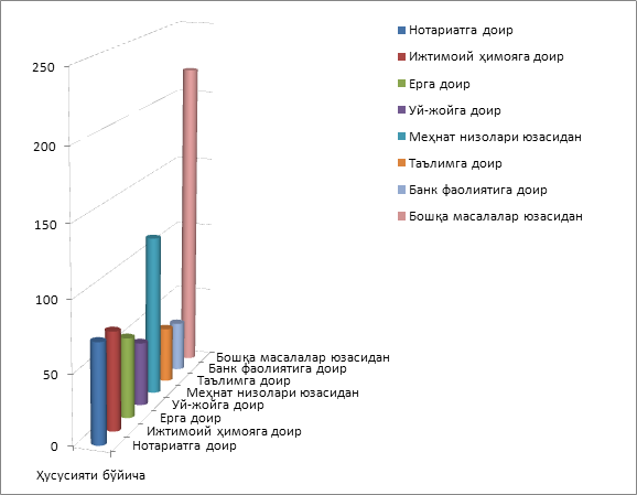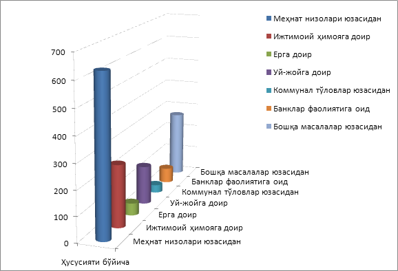 Бошқармага ҳисобот даврида келиб тушган шикоятларнинг ҳусусият бўйича кўриб чиқилганда, энг кўп мурожаатлар 113 таси меҳнат низолари юзасидан, 71 таси нотариатга доир қонун ҳужжатлари юзасидан, 70 таси ижтимоий ҳимояга доир қонунлар юзасидан, 57 таси ерга доир қонун ҳужжатлари юзасидан, 45 таси уй-жойга доир қонунлар юзасидан, 39 таси таълимга доир, 35 таси банк фаолиятига доир қонун ҳужжатлари юзасидан ҳамда 218 таси бошқа масалалар юзасидан келиб тушган.