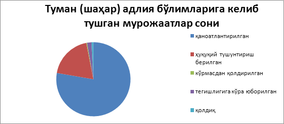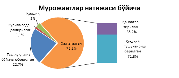 Ҳисобот даврида келиб тушган 1 661 та мурожаатларнинг 1 222 таси ҳал этилган бўлиб, шундан 345 таси ёки 20.8 фоизи қаноатлантирилган, 871 таси ёки 52.4 фоизига ҳуқуқий тушунтириш берилган (мурожаатларни ҳал этишда 161 таси жойига чиқиб ўрганилган бўлса, 146 таси бўйича мутахассис жалб этилган), 6 таси рад этилган, 380 та мурожаат ҳал этиш учун тааллуқлиги бўйича юборилган, 19 таси кўрилмасдан қолдирилган (ёки аноним), 50 таси иш юритувда қолдиқ бўлганлиги сабабли кўриб чиқилмоқда. (ўтган йилдан 10 та мурожаат қолдиқ бўлиб ўтган)