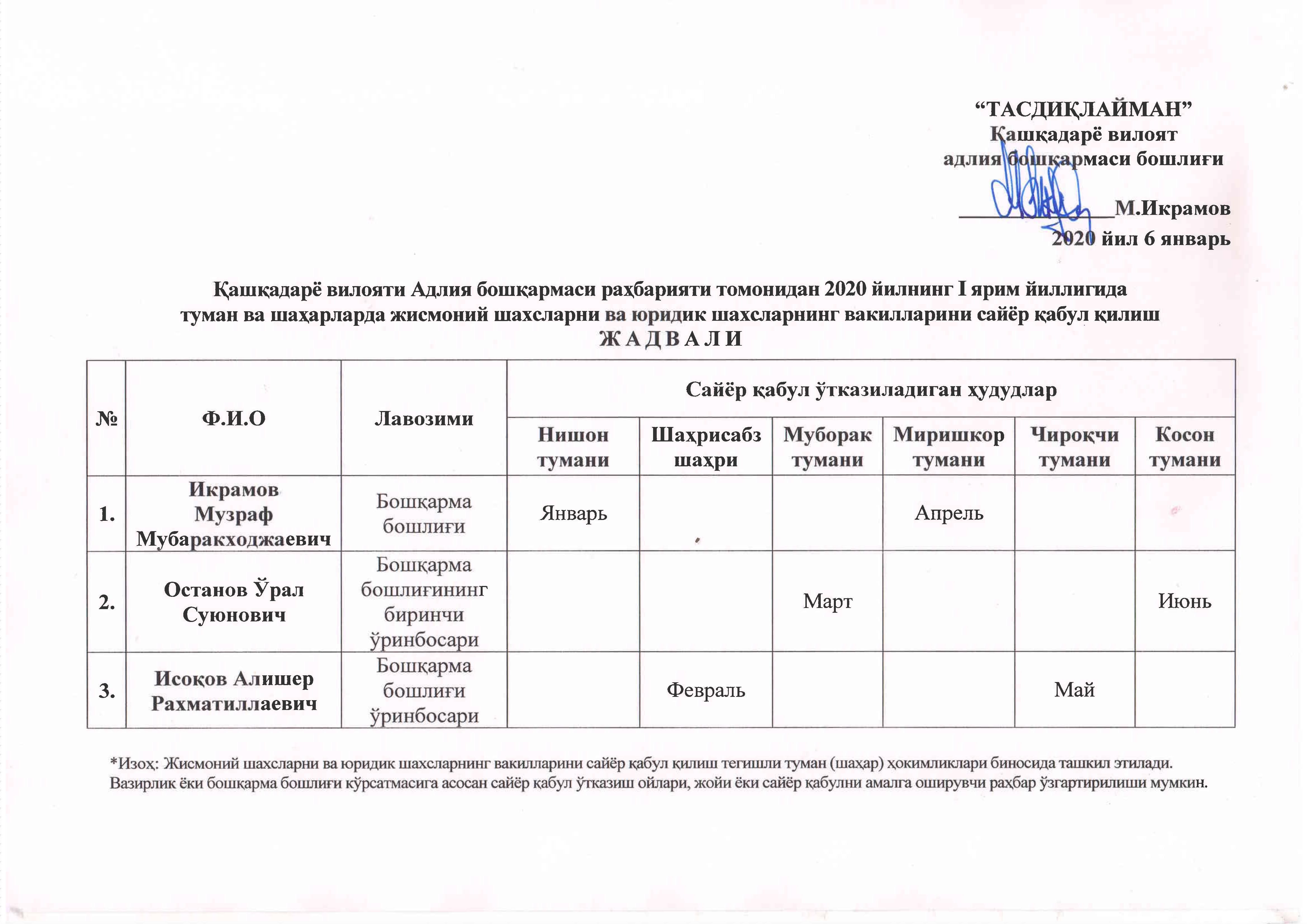 Қашқадарё вилояти адлия бошқармаси раҳбарияти томонидан ўтказиладиган сайёр қабул жадвали