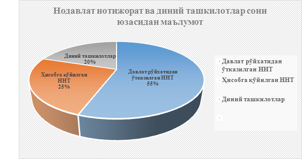 2019 йил давомида нодавлат нотижорат ташкилотлар жами 749 тани ташкил этиб, шундан 518 та давлат рўйхатидан ўтказилган, 231 та ҳисобга қўйилган. 185 та диний ташкилотлар, шундан 2 та ноисломий диний ташкилот ҳисобланади.