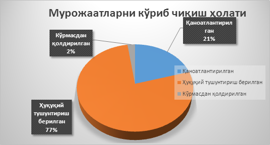 Ҳисобот даври давомида бўлимга 44 та ариза ва шикоятлар келиб тушган бўлиб, шулардан 16 та ариза, 24 та шикоят, шундан 9 та қаноатлантирилган, 34 та мурожаатга ҳуқуқий тушунтириш берилган, 1 та мурожаат қўрмасдан қолдирилган. 4 та мурожаат жойига чиққан ҳолда мурожаат муаллифи иштирокида ўрганилган.