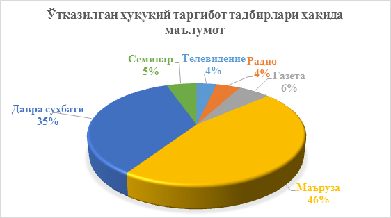 Бўлим томонидан шу давр мобайнида жами 280 та тарғибот тадбирлари ташкил этилиб, шундан 10 маротаба телевидениеда, 12 маротаба радиода, 16 маротаба газетада чиқишлар қилинди. Маҳаллаларда, меҳнат жамоаларида ва бошқа жойларда 128 маротаба маъруза, 99 маротаба давра суҳбати ҳамда