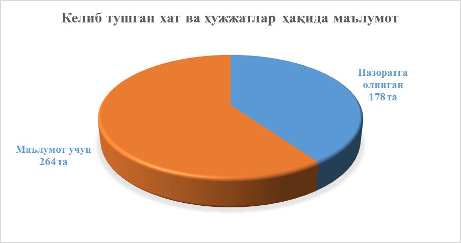 Нодавлат нотижорат ташкилотлар бўлимига 2019 йил давомида 442 та хат, ҳужжатлар келиб тушган бўлиб, шундан 178 та назоратга олинган, 264 та маълумот сифатида қабул қилинган, 23 та Адлия вазирлигидан топшириқ хат сифатида келган, 171 та хат ҳужжатлар ижроси ўз вақтида таъминланган, 7 та хат ҳужжат қолдиқ сифатида ўтган.