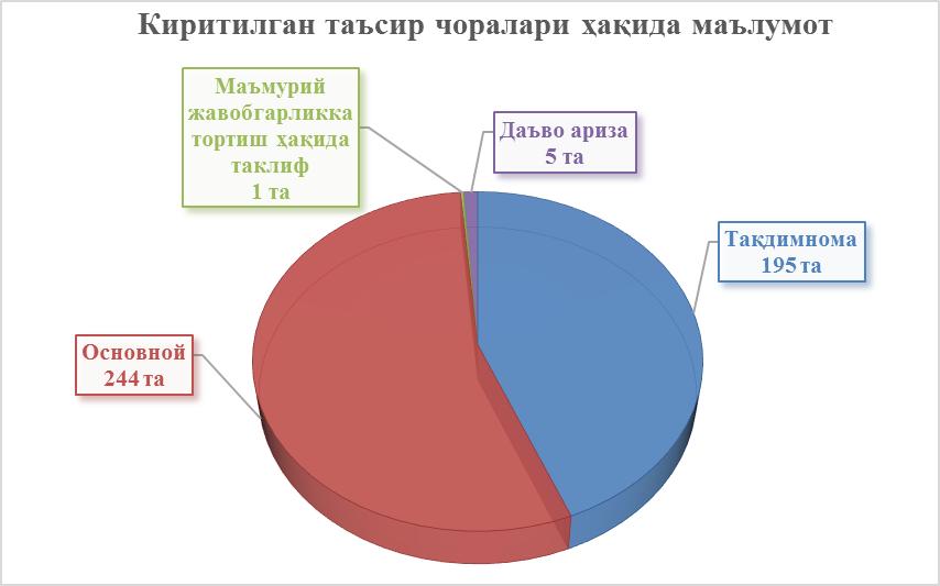 Ўтказилган ўрганишлар натижаларига кўра, жами 2 166 та қонунбузилиш ҳолатлари аниқланиб, мазкур қонунбузилиш ҳолатларини олдини олиш ва келгусида такроран содир этмаслик мақсадида 45 та тақдимнома киритилди.