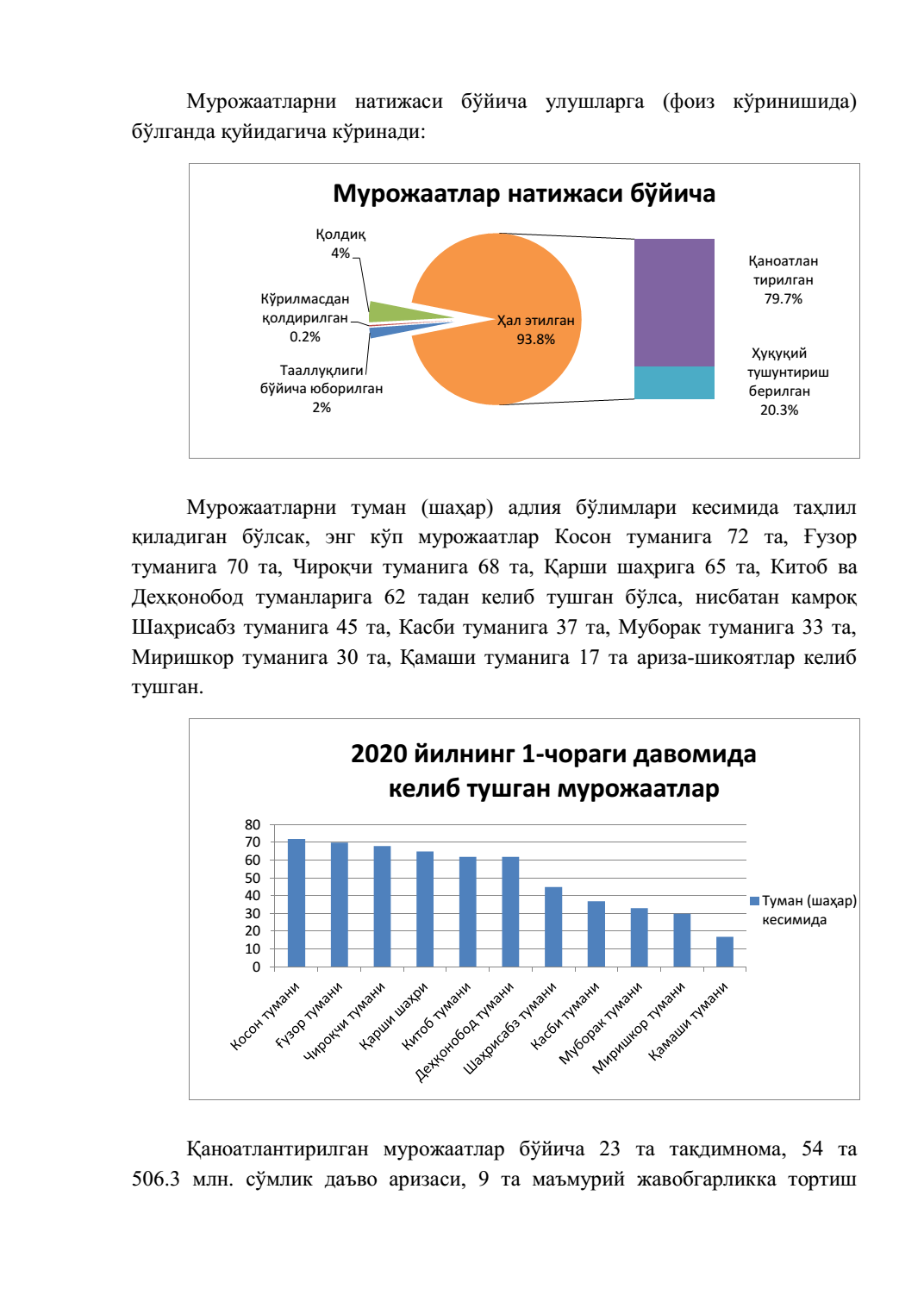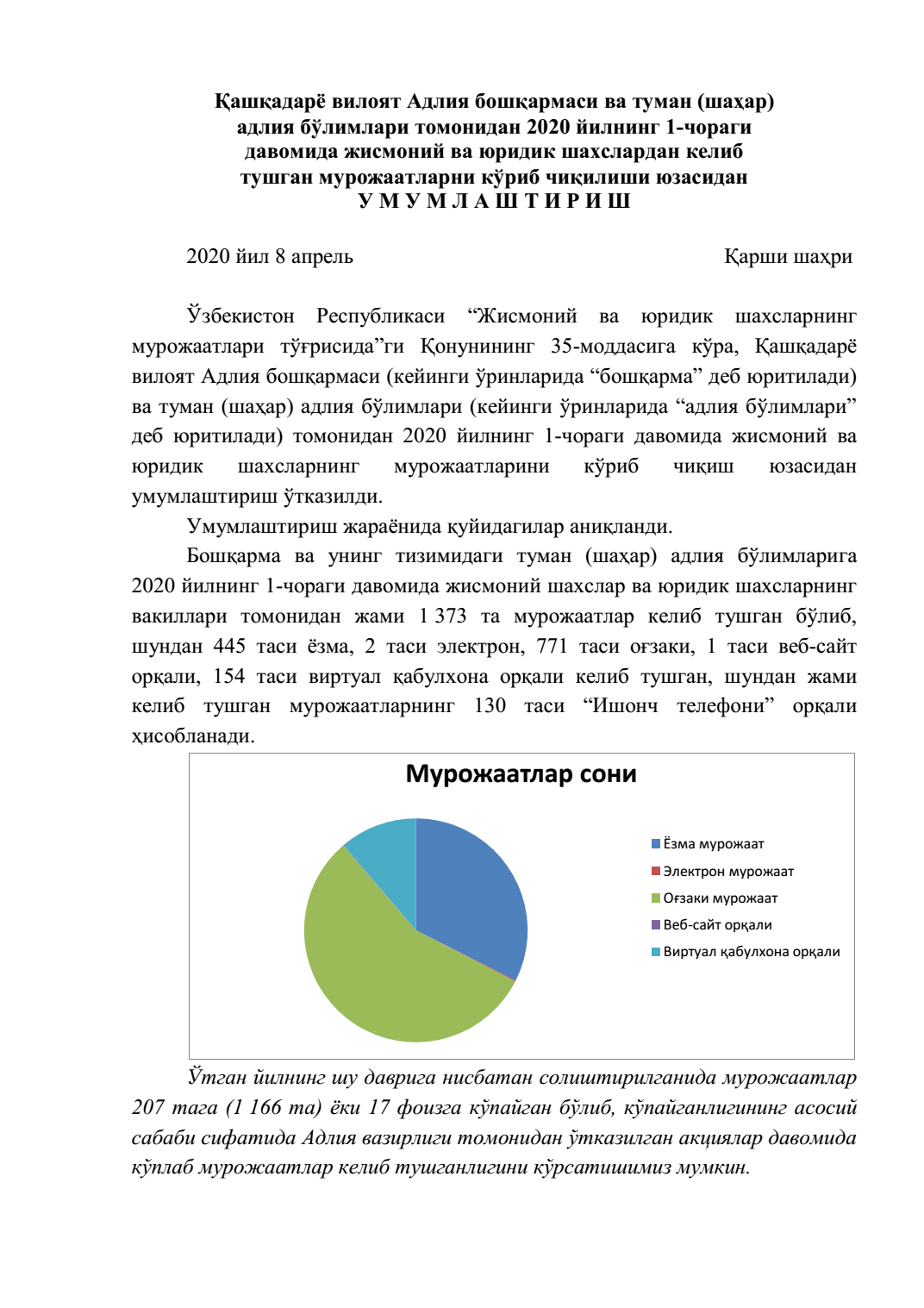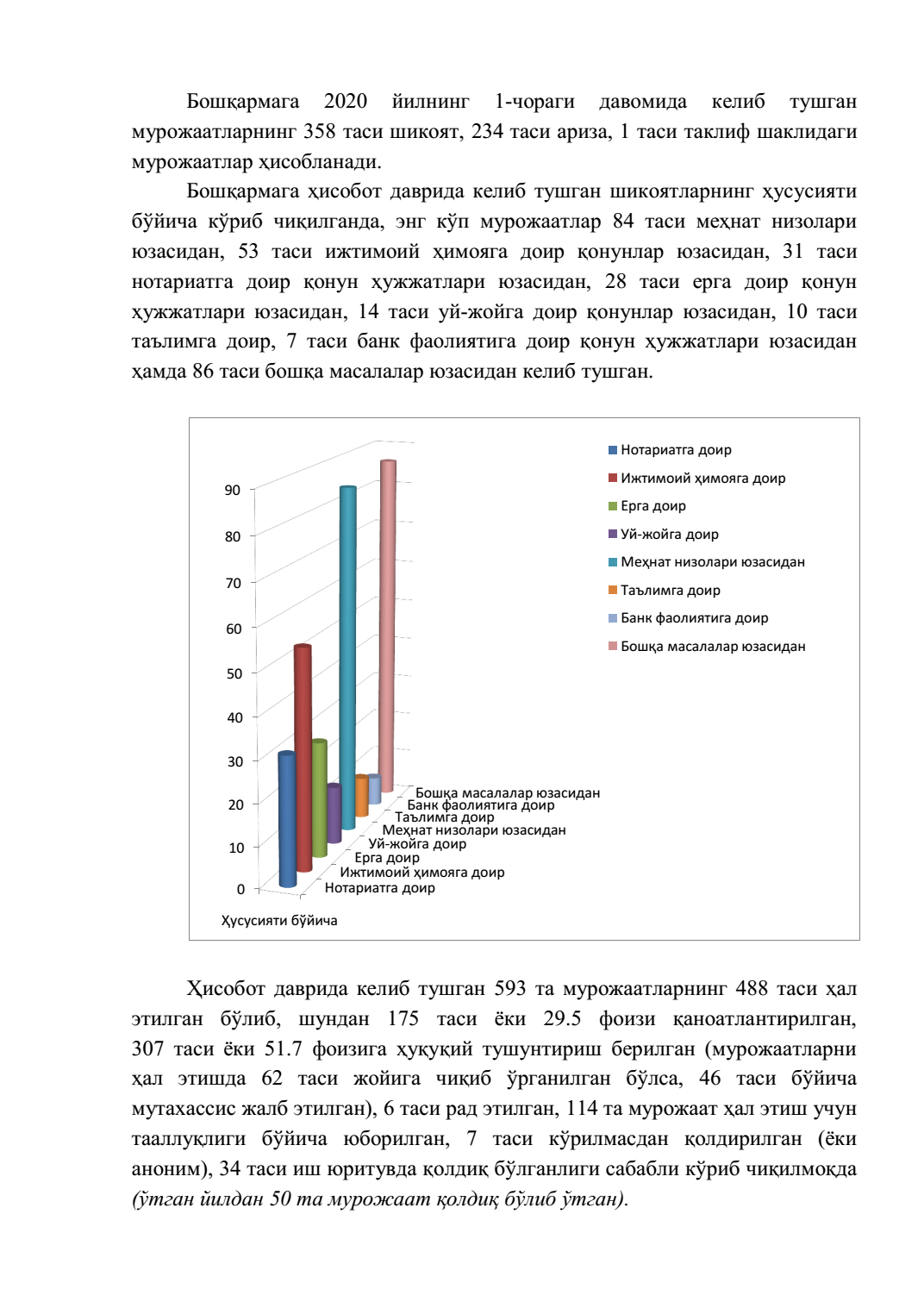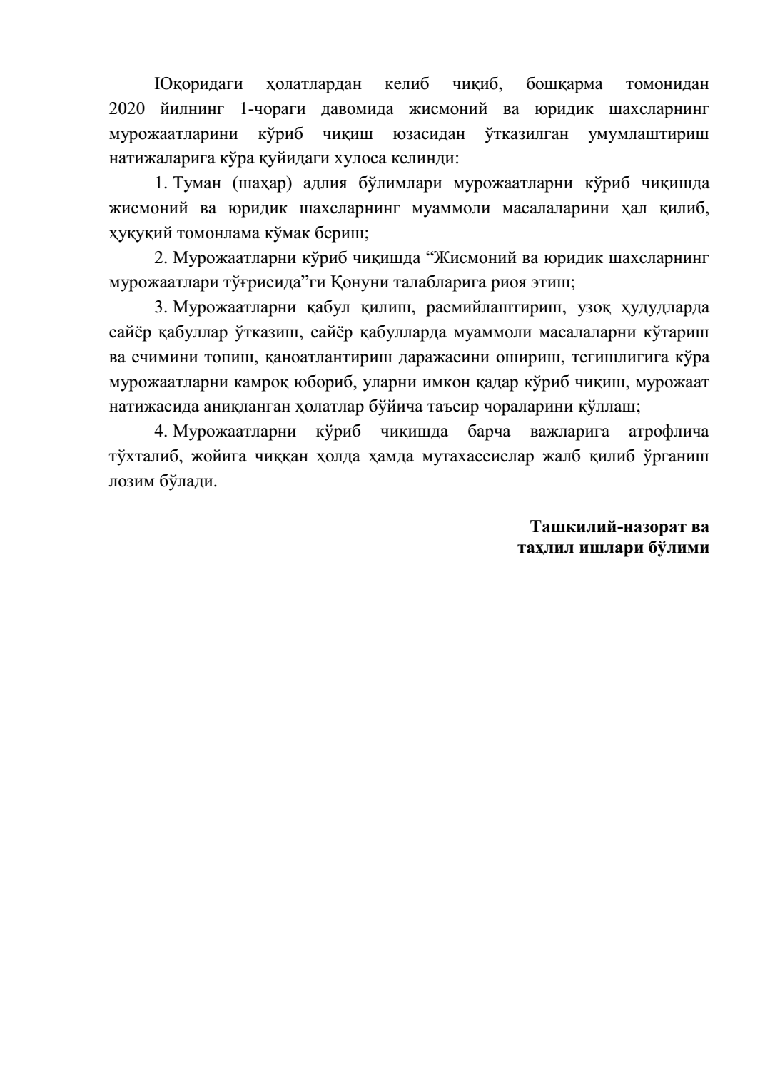 2020 йилнинг 1-чораги давомида жисмоний ва юридик шахслардан келиб тушган мурожаатларни кўриб чиқилиши юзасидан