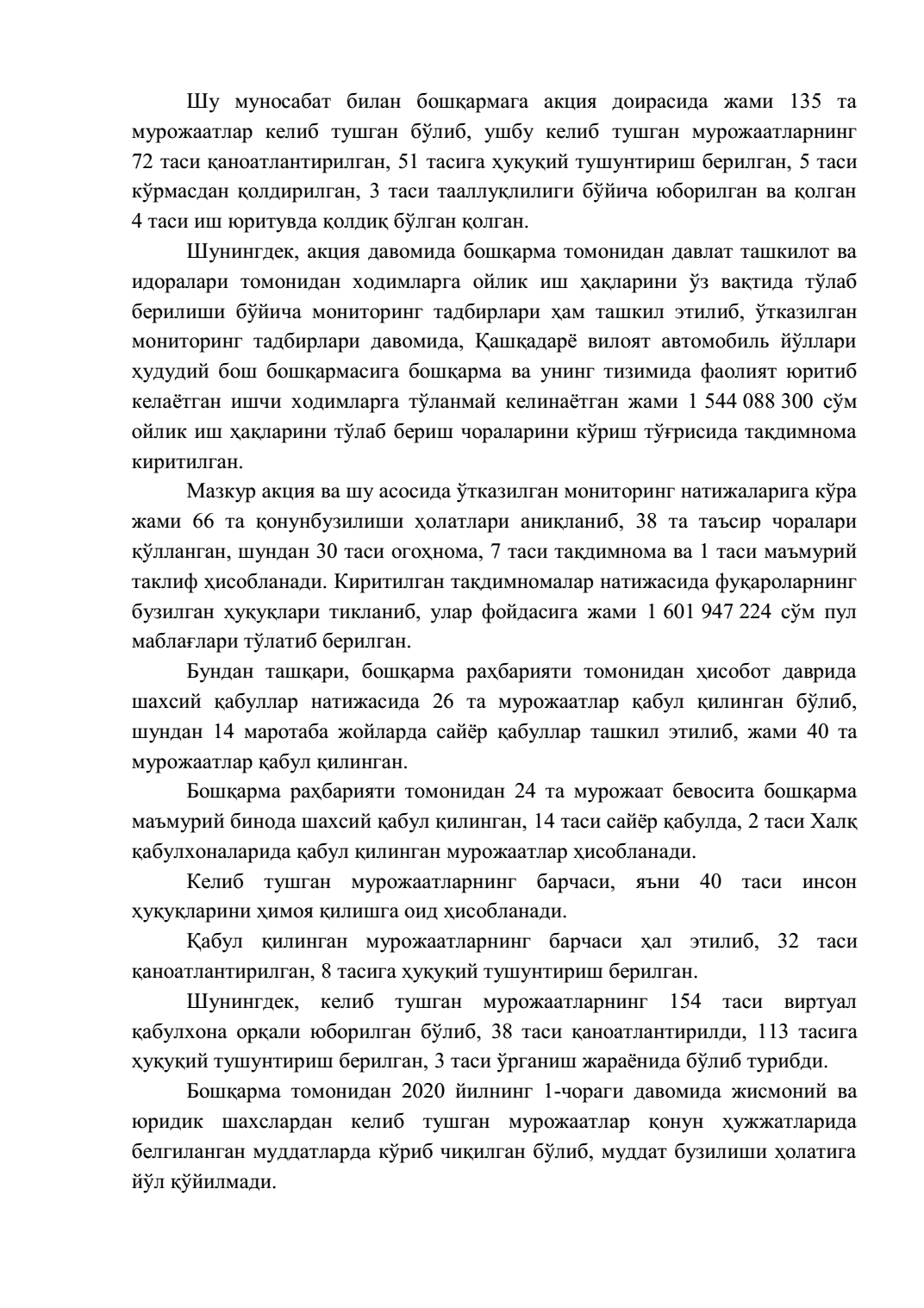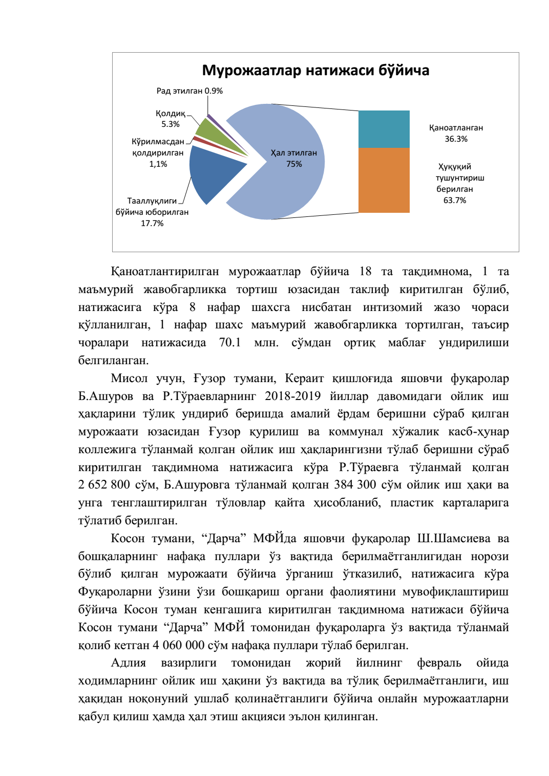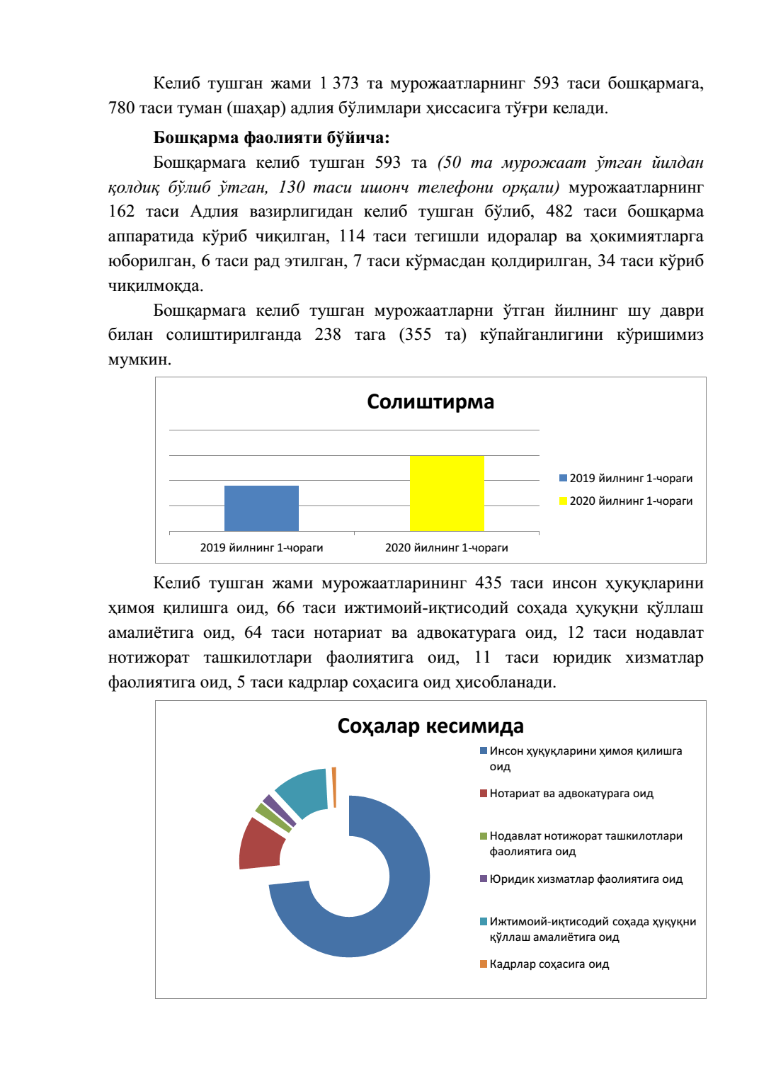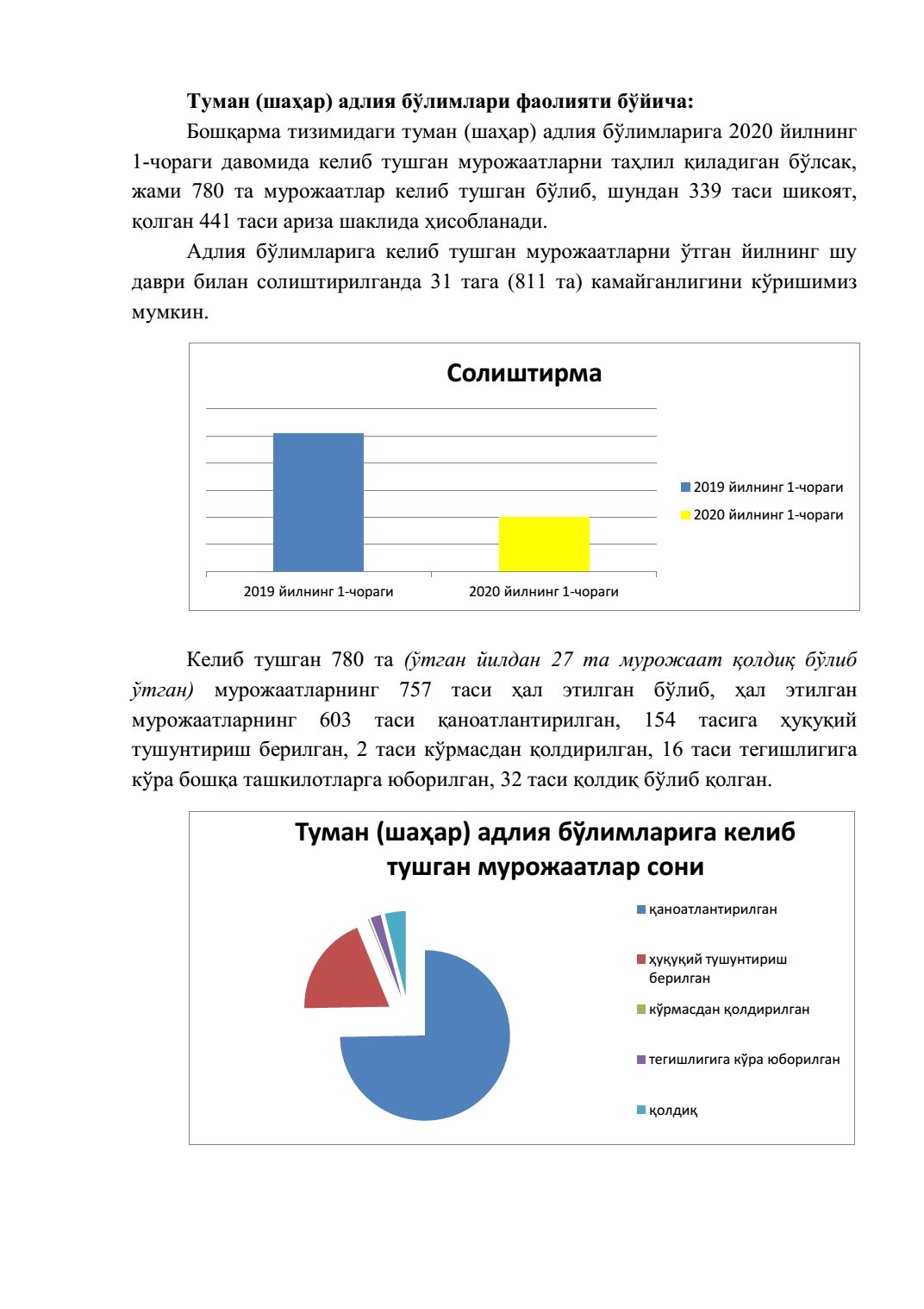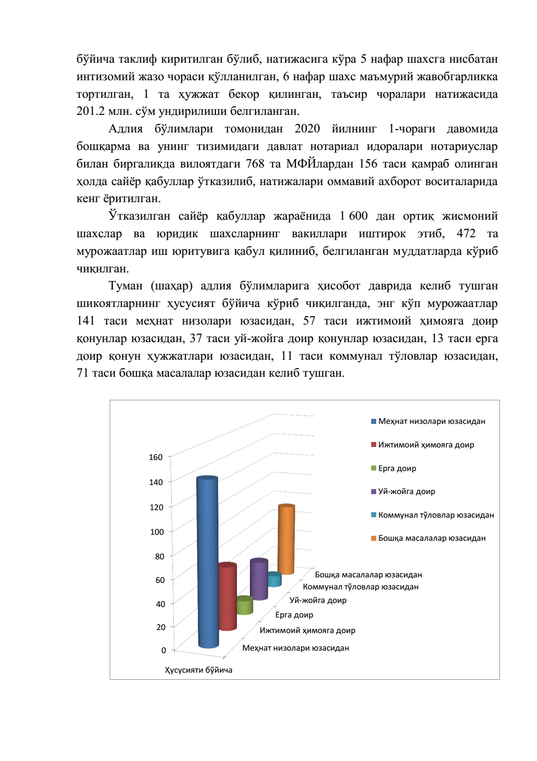 2020 йилнинг 1-чораги давомида жисмоний ва юридик шахслардан келиб тушган мурожаатларни кўриб чиқилиши юзасидан
